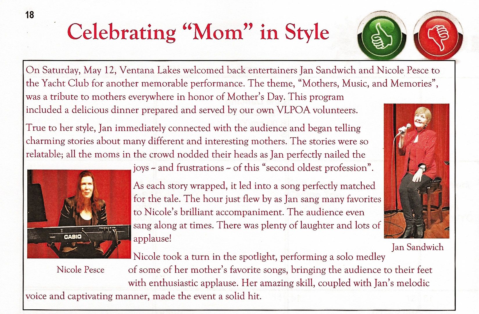 "The chemistry between these two ladies was obvious and filled the room with energy. With four standing ovations throughout the show, the audience certainly let them know how much we enjoyed it!" - Ventana Lakes Community, Arizona